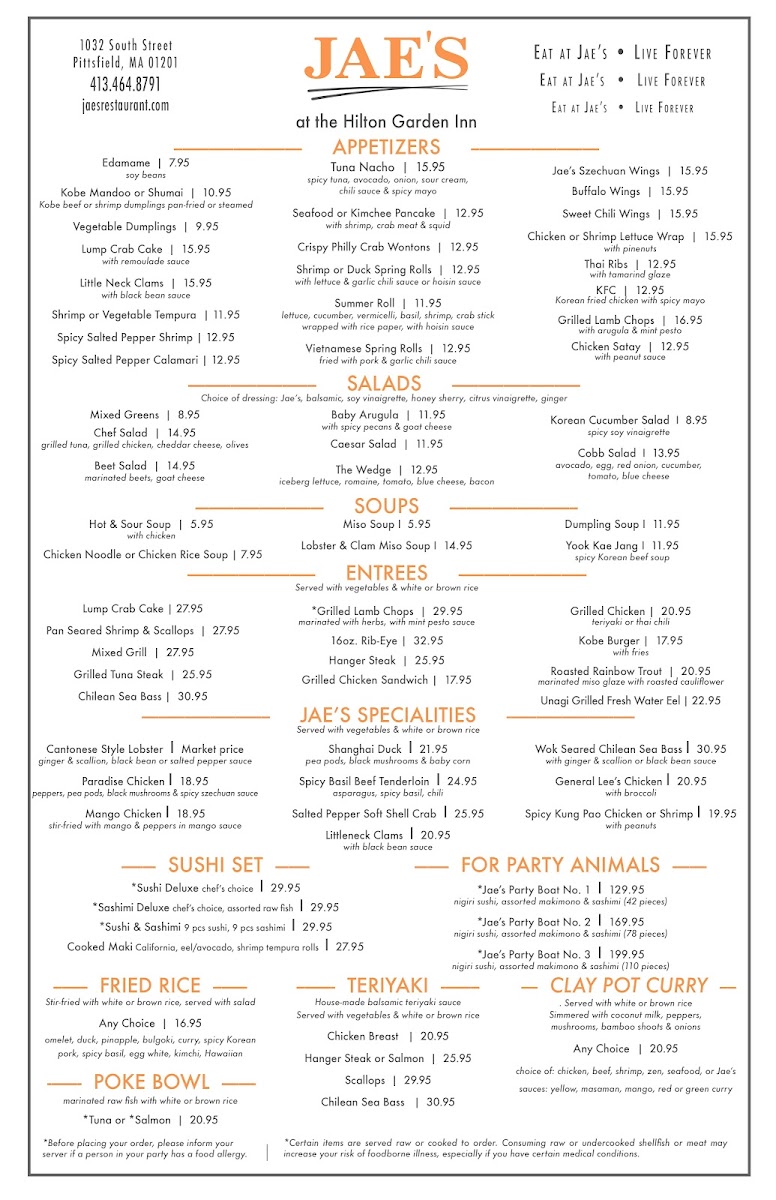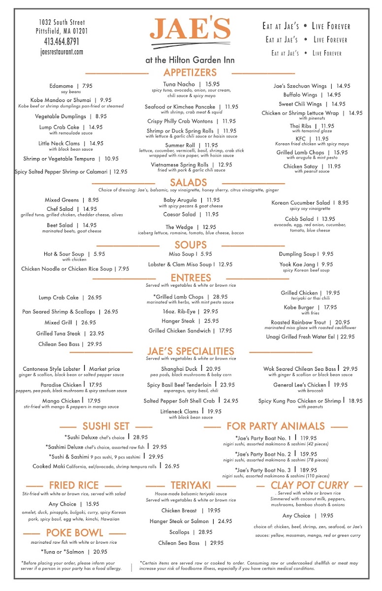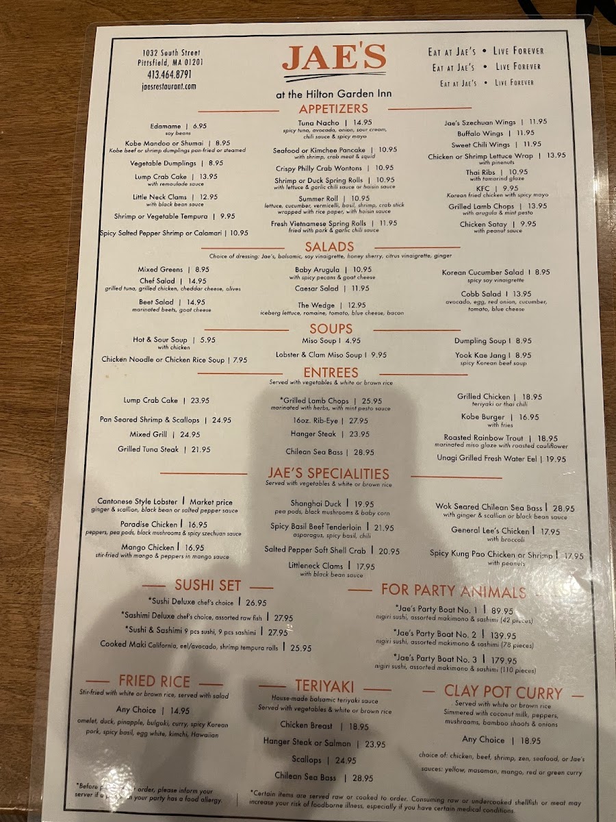 Welcome to Jae's at the Hilton Garden Inn, a hidden gem located at 1032 South St, Pittsfield, MA. This delightful restaurant offers a diverse menu that showcases the rich flavors of Korean cuisine alongside delectable sushi and classic entrees. Whether indulging in the Seafood Soon Tofu Jigae or savoring the Roasted Rainbow Trout, each dish is thoughtfully prepared, promising a memorable dining experience.