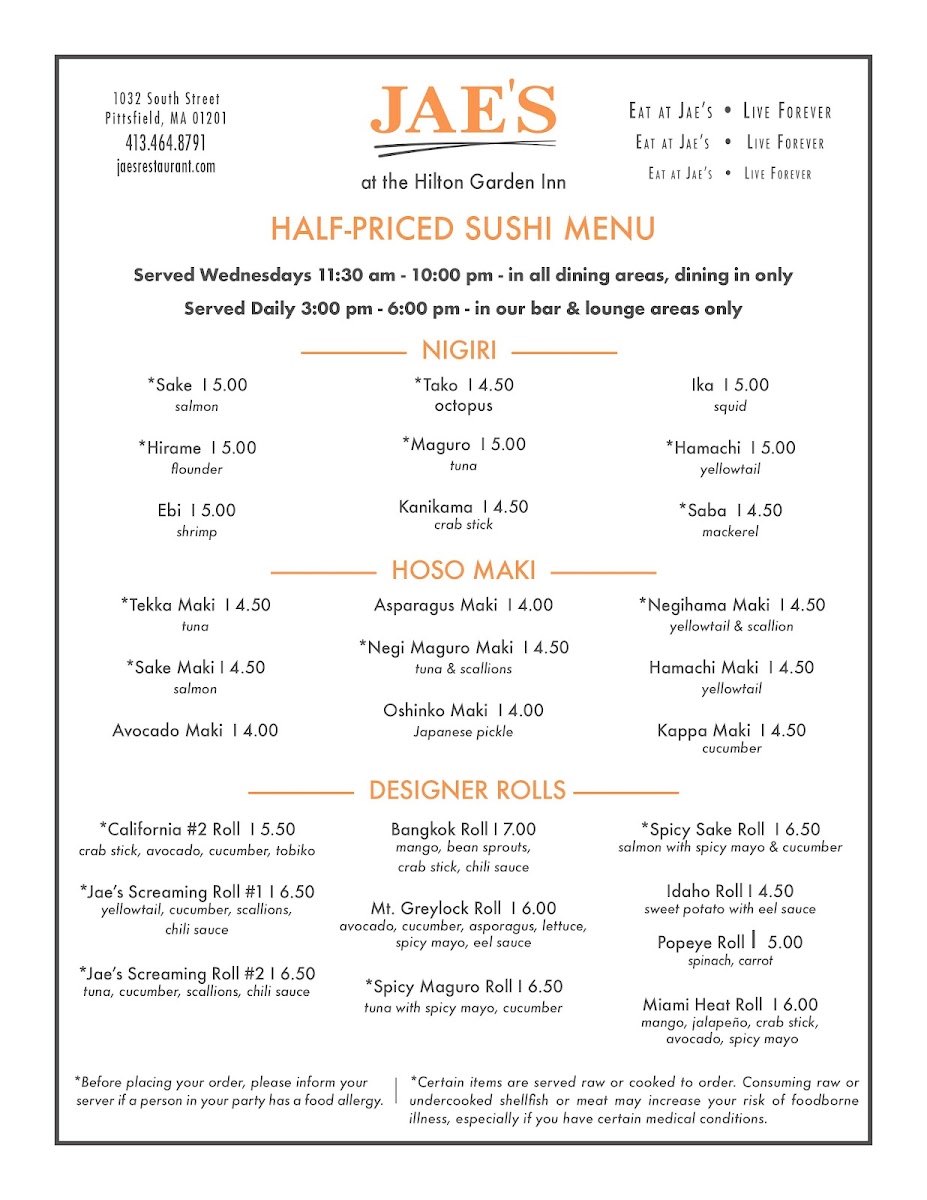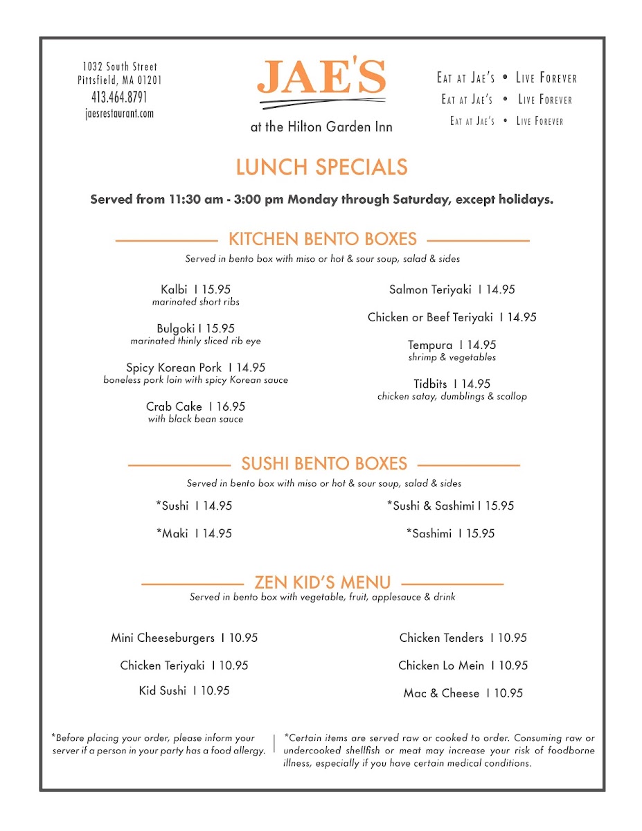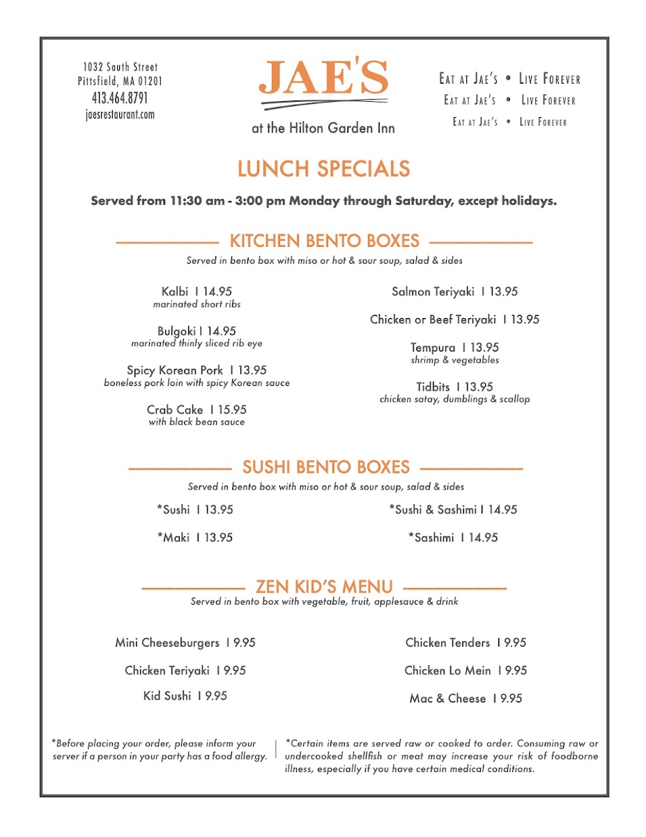 Welcome to Jae's at the Hilton Garden Inn, a hidden gem located at 1032 South St, Pittsfield, MA. This delightful restaurant offers a diverse menu that showcases the rich flavors of Korean cuisine alongside delectable sushi and classic entrees. Whether indulging in the Seafood Soon Tofu Jigae or savoring the Roasted Rainbow Trout, each dish is thoughtfully prepared, promising a memorable dining experience.